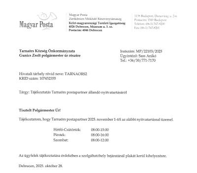 Tarnaörs postapartner nyitvatartás - 2025.11.27.
